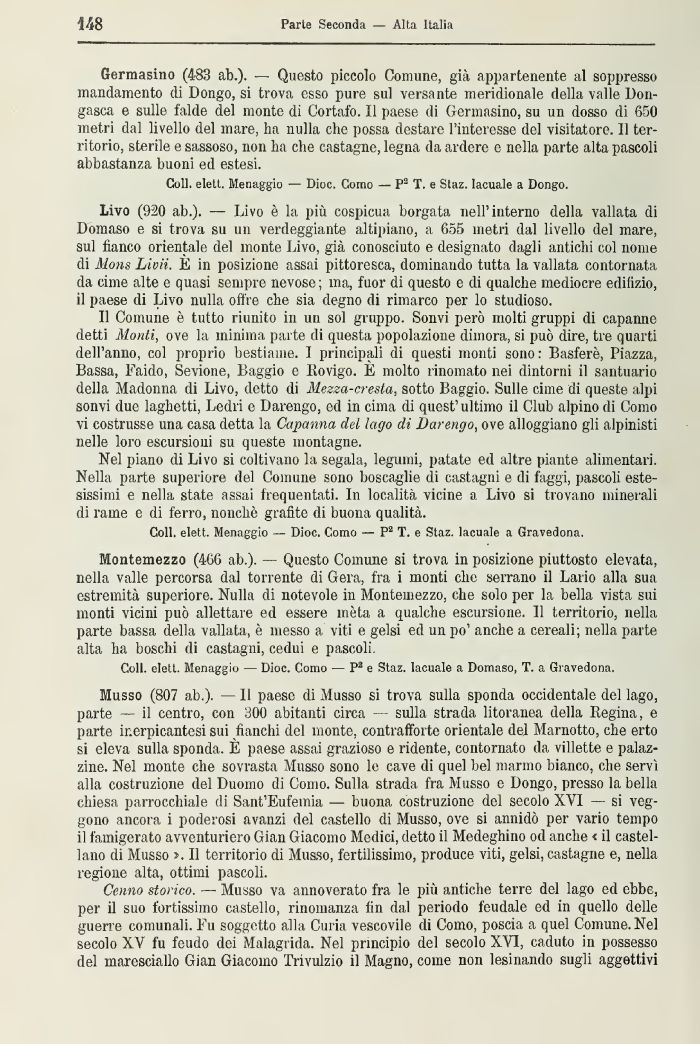 Germasino (483 ab.). — Questo piccolo Connine, già appartenente al soppresso mandamento di Dongo, si trova esso pure sul versante meridionale della valle Dou-gasca e sulle falde del monte di Corta,fo. Il paese di Germasino, su un dosso di 650 metri dal livello del mare, ha nulla che possa destare l'interesse del visitatore. Il territorio, sterile e sassoso, non ha che castagne, legna da ardere e nella parte alta pascoli abbastanza buoni ed estesi.