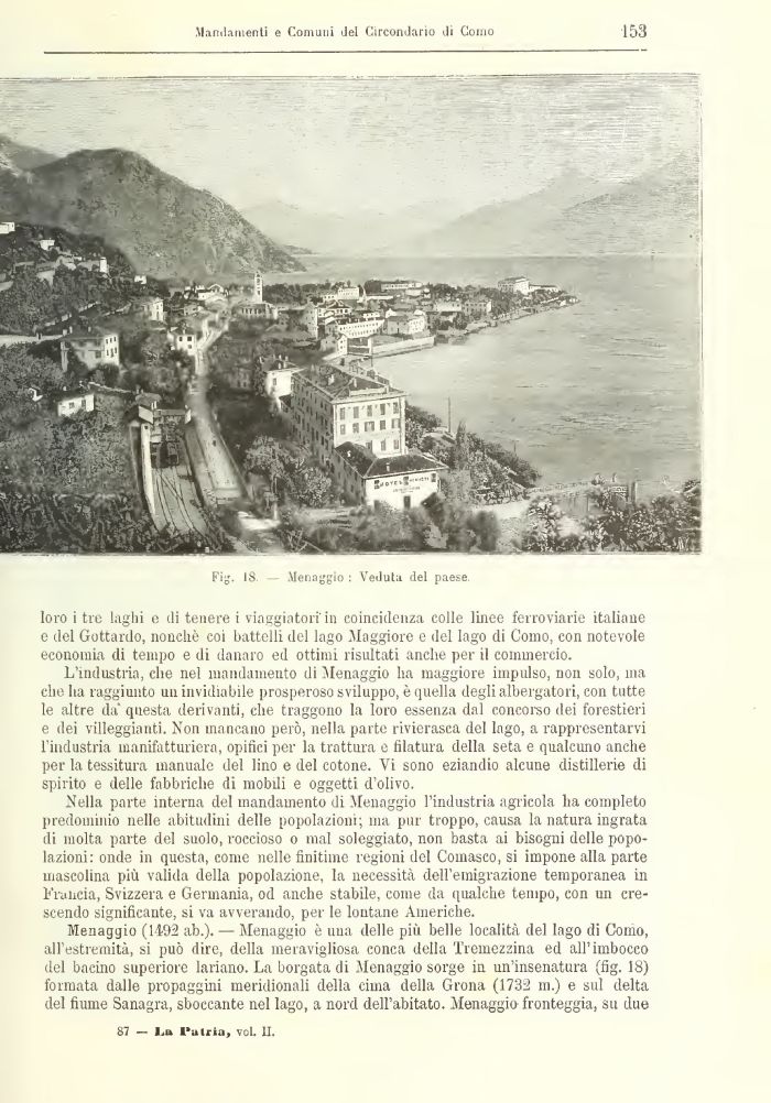 Menaggio (1492 ab.). — Menaggio è una delle più belle località del lago di Como, all'estremità, si può dire, della meravigliosa conca della Tremezzina ed all'imbocco del bacino superiore lariano. La borgata di Menaggio sorge in un'insenatura (fig. 18) formata dalle propaggini meridionali della cima della Grona (1732 m.) e sul delta del fiume Sanagra, sboccante nel lago, a nord dell'abitato. Menaggio fronteggia, su due