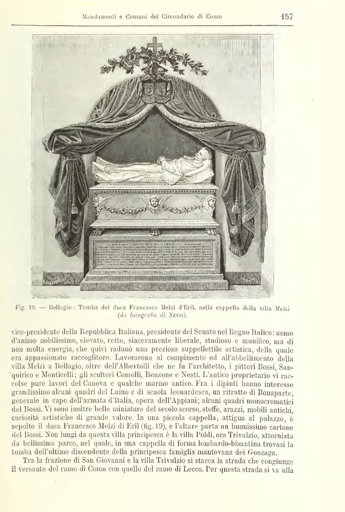 vice-presidente della Repubblica Italiana, presidente del Senato nel Regno Italico: uomo d'animo nobilissimo, elevato, retto, sinceramente liberale, studioso e munifico, ma di non molta energia, che Sitivi radunò una preziosa suppellettile artistica, della quale era appassionato raccoglitore. Lavorarono al compimento ed all'abbellimento della villa Melzi a Bellagio, oltre dell'Albertolli che ne fu l'architetto, i pittori Bossi, San-quirico e Monticelli; gli scultori Comolli, Benzene e Nesti. L'antico proprietario \i raccolse pure lavori del Canova e qualche marcio antico. Fra i dipinti hanno interesse grandissimo alenili quadri del Luino e di scuola leonardesca, un ritratto di Bonaparte, generale in capo dell'armata d'Italia, opera dell'Appiani; alcuni quadri monocromatici del Bossi. Vi sono inoltre belle miniature del secolo scorso, stoffe, arazzi, mobili antichi, curiosità artistiche di grande valore. In una piccola cappella, attigua al palazzo, è sepolto il duca Francesco Melzi di Eril (fig. 19), e l'altare porta un buonissimo cartone del Bossi. Non lungi da questa villa principesca è la villa l'oidi, ora Trivulzio, attorniata da bellissimo parco, nel quale, in una cappella di forma lombardo-bisantina trovasi la tomba dell'ultimo discendente della principesca famiglia mantovana dei Gonzaga.