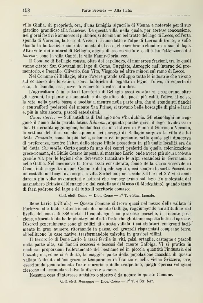 Bene Lario (573 ab.). — Questo Comune si trova quasi nel mezzo della vallata di Porlezza, alle falde settentrionali del monte Galbiga, raggiungendo un'altitudine dal livello del mare di 382 metri. Il capoluogo è un grazioso paesello, in ridente posizione, attorniato da belle piantagioni d'alto fusto che gli danno aspetto lieto ed agreste. Discreti generalmente sono gli edilizi di questa vallata, i cui abitatori, emigranti facilmente in gran numero, ritornando in paese, coi gruzzoli risparmiati comprano terre, abbelliscono le case native, trasformandole talvolta in graziosi villini.