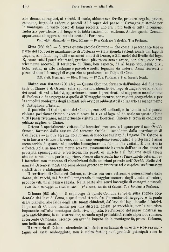 daino con Osteno (738 ab.). — Questo Comune, formato dall'unione dei due paeselli di.Claino e di Osteno, sulla sponda meridionale del lago di Lugano ed alle falde dei monti di vai d'Intelvi, apparteneva, come i precedenti, al soppresso mandamento di Porlezza e fu aggregato a ciucilo di Menaggio; mentre, per ragioni geografiche e per la comodità medesima degli abitanti, più ovvio sarebbe stato il collegarlo al mandamento di Castiglione d'Intelvi.