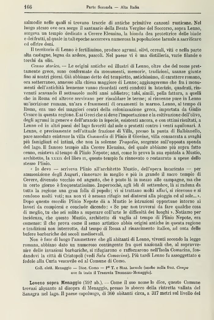 Cenno storico. — Le origini antiche ed illustri di Lenno, oltre che del nome prettamente greco, sono confermate da monumenti, memorie, tradizioni, usanze giunte fino ai nostri giorni. Già abbiamo detto del tempietto, antichissimo, di carattere romano, ora sotterraneo, annesso alla chiesa maggiore di Lenno; aggiungeremo che fra i monumenti dell'antichità lennense vanno ricordati certi condotti in laterizio, quadrati, rinvenuti scavando il sottosuolo molti anni addietro; tubi, simili, pella fattura, a quelli che in Roma ed altrove servivano per riscaldare le tenne; si rinvenne pure in Lenno un'iscrizione romana, un'ara e frammenti eli ornamenti in marino. Lenno, al tempo di Roma, era uno dei maggiori centri della colonizzazione greca, importata da Giulio Cesare, ili questa regione. È ai Greci che si deve l'importazione e la coltivazione dell'olivo, degli agrumi in genere e dell'arancio in ispecie, esistenti ancora, e con ottimi risultati, a Lenno ed in altri paesi del lago favoriti dal sole o protetti contro i venti aquilonari. A Lenno, e precisamente nell'attuale frazione di Villa, presso la punta di Balbianello, pare assodato esistesse la villa Commedia di Plinio il Giovine, villa consacrata a svaghi più famigliari ed intimi, che non la solenne Tragedia, sorgente sull'opposta sponda del lago. Il famoso tempio alla Cerere Eleusina, del quale abbiamo più sopra fatto cenno, esisteva al tempo di Plinio Nepote; anzi, come lo prova la sua epistola a Mustio, architetto, la xxxix del libro ìx, questo tempio fu rinnovato o restaurato a spese dello stesso Plinio.
