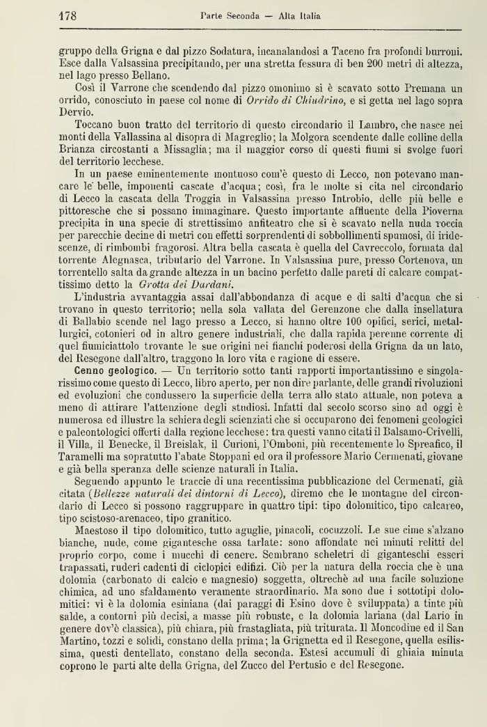 Cenno geologico. — Un territorio sotto tanti rapporti importantissimo e singolarissimo come questo di Lecco, libro aperto, per non dire parlante, delle grandi rivoluzioni ed evoluzioni che condussero la superficie della terra allo stato attuale, non poteva a meno di attirare l'attenzione degli studiosi. Infatti dal secolo scorso sino ad oggi è numerosa ed illustre la schiera degli scienziati che si occuparono dei fenomeni geologici e paleontologici offerti dalla regione lecchese : tra questi vanno citati il Balsamo-Crivelli, il Villa, il Benecke, il Breislak, il Curioni. l'Oniboni, più recentemente lo Spreafico, il Taramelli ma sopratutto l'abate Stoppani ed ora il professore Mario Cermenati, giovane e già bella speranza delle scienze naturali in Italia.