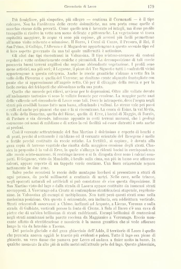 Quello che succede pei rilievi, avviene per le depressioni. Oltre alle valiate dovute all'andamento tectonico vi sono lo vallate formate per erosione. La maggior parte anzi delle vallecole nel circondario di Lecco sono tali. Love le intemperie, dove l'acqua negli strati più credibili hanno fatto man bassa, affondando i valloni. Lo stesso vaio pei passi e. calli ed anche pei pianori che qua e la si riscontrano. La conca di Esino. la vai Moria, la, valle della Domicilia, quella del Pione, quella di Erve, i bacini di Maggio, di Rarzio, di Pasturo e via dicendo, infossano appunto ni certi terreni marnosi, che i geologi conoscono coi nomi di raililiano e di retieo la cui facilità ad esser distrutti è nota anche ai profani.