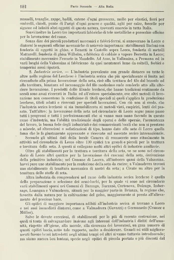 Senza dire dei piccoli produttori meccanici e fabbri-ferrai, si annoverano in Lecco e dintorni le seguenti officine meccaniche di notevole importanza: stabilimenti Barioni con fonderia di oggetti in ghisa, e Benatti in Castello sopra Lecco, fonderia di metalli Matterelli, fonderia di ghisa Wilhelm, e fabbrica di caldaie a vapore Berretta in Lecco; stabilimento meccanico Ferra,rio in Mandello. Ad Asso, in Vallassina, a Premana ed in varia luoghi della Valsassina si fabbricano da quei montanari lame da coltelli, forbici e temperini assai riputati.