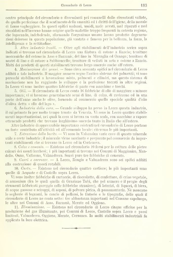 5. Olii. — 11 circondario di Lecco conta 1(5 fabbriche di olio di maggiore o minore importanza; vi si lavorano generalmente semi di lino, (li colza, di ravizzone ed in una parte dell'anno anche le olive, fornendo al commercio quella speciale qualità d'olio d'oliva (letta < olio del lago >.