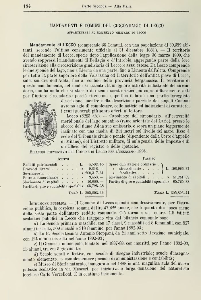 Lecco (8285 ab.). — Capoluogo del circondario, all'estremità meridionale del lago omonimo (ramo orientale del Lario), presso lo sbocco del tiume Adda suo emissario, e sopra un piano leggermente inclinato con una media di 214 metri sul livello del mare. Esso è sede del Tribunale civile e penale (dipendente dalla Corte d'appello di Milano), del Distretto militare, di un'Agenzia delle imposte e di un Ufficio del registro e delle ipoteche. Bilancio preventivo del Comune di Lecco pf.k l'esercizio 1894: