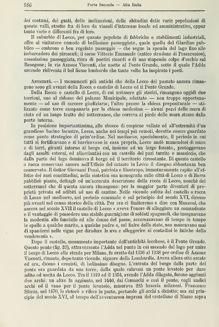 Dopo il castello, monumento importante dell'antichità lecchese, è il Ponte Grande. Questo ponte (fig. 23), attraversante l'Adda nel punto in cui uscendo dal lago por unire il borgo di Lecco alla strada per Milano, fu eretto dal 1336 al 1338 per ordine di Azzone Visconti, rimasto, dopo tante vicende, signore della Lombardia. Aveva allora otto arcate ed era, dicono ì cronisti, di bellissimo disegno. L'entrata del borgo dalla parte del ponte era guardata da una torre, dalla quale calavasi un ponte levatoio per dare adito od uscita da Lecco. Tra il 1349 ed il 1354, avendo l'Adda dilagato, furono aggiunti due archi: un altro fu aggiunto, nel 1440, dai Comaschi e così il ponte, cogli undici archi ed il vano per il ponte levatoio, misurava 225 braccia milanesi. Francesco Sforza, nel 1470, lo ristorò e rifece in parte, portando gli archi a diciotto; ma sul principio del secolo XVI, al tempo dell'avventurosa impresa del castellano di Musso sopra