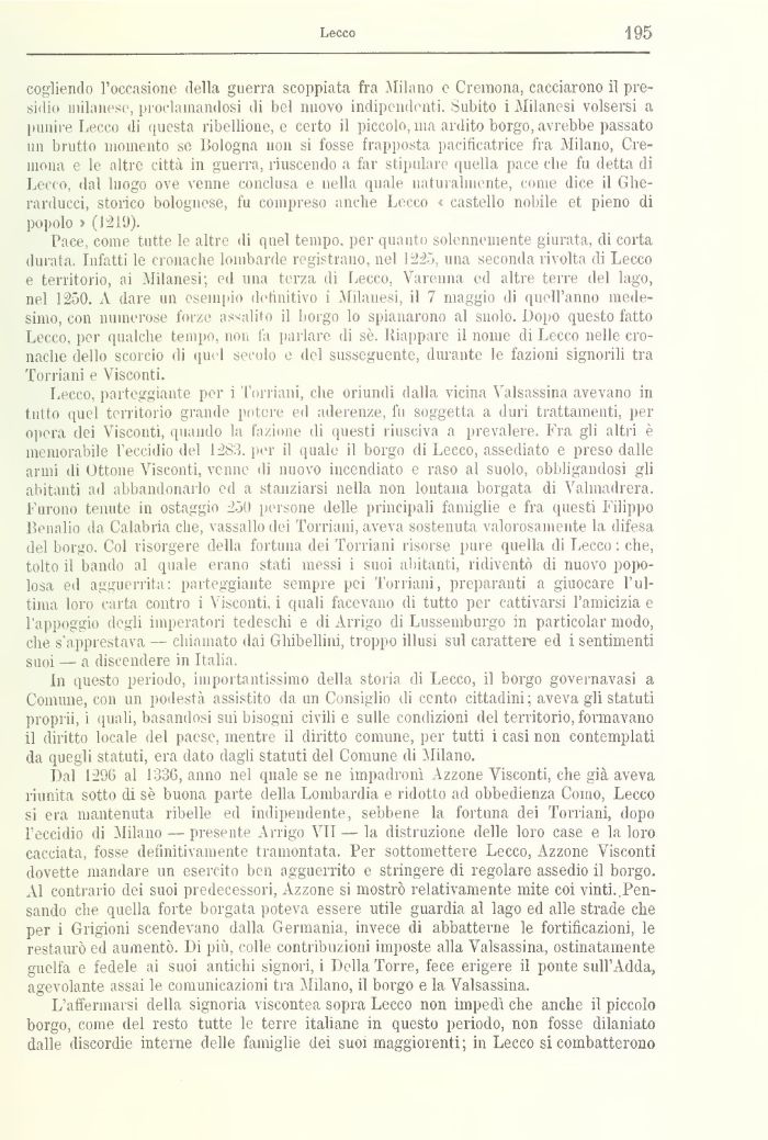 Lecco, parteggiarne per i l'orriani, che oriundi dalla vicina Valsassina avevano in tutto quel territorio grande potere ed aderenze, fu soggetta a duri trattamenti, per opera dei Visconti, «piando la fazione di questi riusciva a prevalere. Fra gli altri è memorabile l'eccidio del 1283. per il quale il borgo di Lecco, assediato e preso dalle armi ili Ottone Visconti, venne di nuovo incendiato e raso al suolo, obbligandosi gli abitanti ad abbandonarlo ed a stanziarsi nella non lontana borgata di Valmadrera. Furono tenute in ostaggio 250 persone delle principali famiglie e fra questi Filippo Penalio da Calabria che, vassallo dei Torriani, aveva sostenuta valorosamente la difesa del borgo. Col risorgere della fortuna dei Torriani risorse pure quella di Lecco : che, tolto il bando al quale erano stati messi ì suoi abitanti, ridiventò di nuovo popolosa ed agguerrita: parteggiali!» sempre pei Torriani, preparanti a giuocare l'ultima loro carta contro i \ isconti, ì quali facevano di tutto per cattivarsi l'amicizia e l'appoggio degli imperatori tedeschi e di Arrigo di Lussemburgo m particolar modo, che s'apprestava — chiamato dai Ghibellini, troppo illusi sul carattere ed i sentimenti suoi — a discendere in Italia.