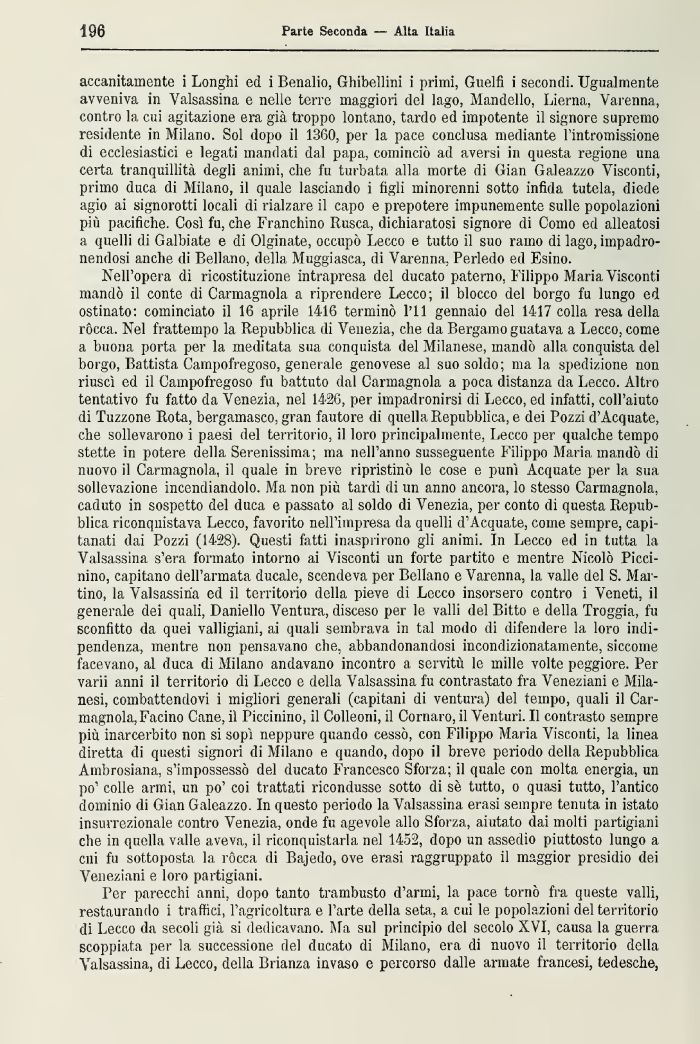 accanitamente i Longhi ed i Benalio, Ghibellini i primi, Guelfi 1 secondi. Ugualmente avveniva in Valsassina e nelle terre maggiori del lago, Mandello, Lierna, Varenna, contro la cui agitazione era già troppo lontano, tardo ed impotente il signore supremo residente in Milano. Sol dopo il 13G0, per la pace conclusa mediante l'intromissione di ecclesiastici e legati mandati dal papa., cominciò ad aversi in questa regione una certa tranquillità degli animi, che fu turbata alla morte di Gian Galeazzo Visconti, primo duca di Milano, il quale lasciando i tìgli minorenni sotto infida tutela, diede agio ai signorotti locali di rialzare il capo e prepotere impunemente sulle popolazioni più pacifiche. Così fu, che Franchino Rusca, dichiaratosi signore di Como ed alleatosi a quelli di Galbiate e di 01 gin ale, occupò Lecco e tutto il suo ramo di lago, impadronendosi anche di Bellano, della Muggiasca, di Varenna, Perledo ed Esino.