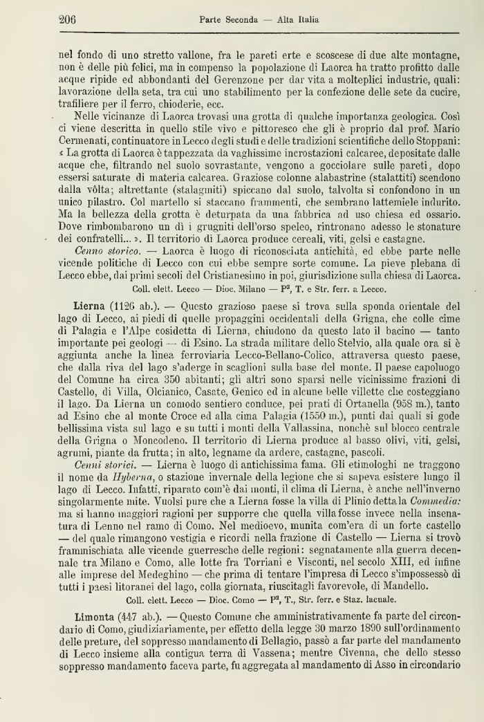 Lierna (112G ab.). •— Questo grazioso paese si trova sulla sponda orientale del lago di Lecco, ai piedi di quelle propaggini occidentali della Grigna, che colle cime di Pai a già e l'Alpe cosìdetta di Lierna, chiudono da questo lato il bacino — tanto importante pei geologi ìg di Esino. La strada militare dello Stelvio, alla quale ora si ò aggiunta anche la linea ferroviaria Leeco-P>ellano-Colico, attraversa questo paese, che dalla riva del lago s'aderge ili scaglioni sulla base del monte, il paese capoluogo del Comune lia circa 350 abitanti; gli altri sono sparsi nelle vicinissime frazioni di Castello, di Villa, Olcianico, Casate, Genico ed in alcune belle villette che costeggiano il lago. Da Lierna un comodo sentiero conduce, pei prati di Ortanella (958 ni.), tanto ad Esilio che al monte Croce ed alla cima Palagia (1550 in.), punti dai quali si gode bellissima vista sul lago e su tutti i monti della Vallassina, nonché sul blocco centrale della Grigna o Moncodeno. Il territorio di Lierna produce al basso olivi, viti, gelsi, agrumi, piante da frutta; in alto, legname da ardere, castagne, pascoli.
