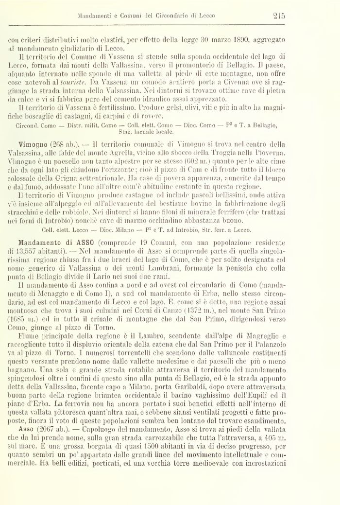 Mandamento di ASSO (comprende 19 Comuni, con una popolazione residente di 13,557 abitanti). — Nel mandamento di Asso si comprende parte di quella singolarissima regione chiusa fra i due bracci del lago di Conio, che è per solito designata col nome generico di Vallassina 0 dei monti Lanibrani, formante la penisola che colla punta di Bellagio divide il Lario nei suoi due rami.