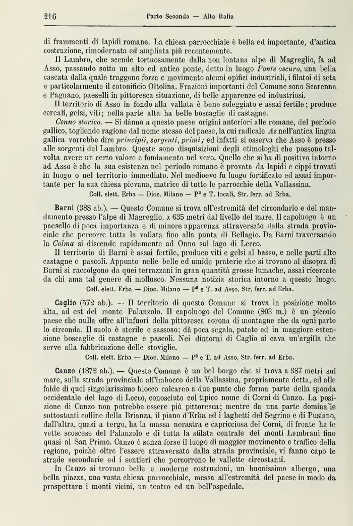 Barni (388 ab.). — Questo Comune si trova all'estremità del circondario e del mandamento presso l'alpe di Magreglio. a 035 metri dal livello del mare. Il capoluogo è un paesello di poca importanza e di minore apparenza attraversato dalla strada provinciale che percorre tutta la vallata fino alla punta di Bellagio. Da Barni traversando la Colma si discende rapidamente ad Onno sul lago di Lecco.