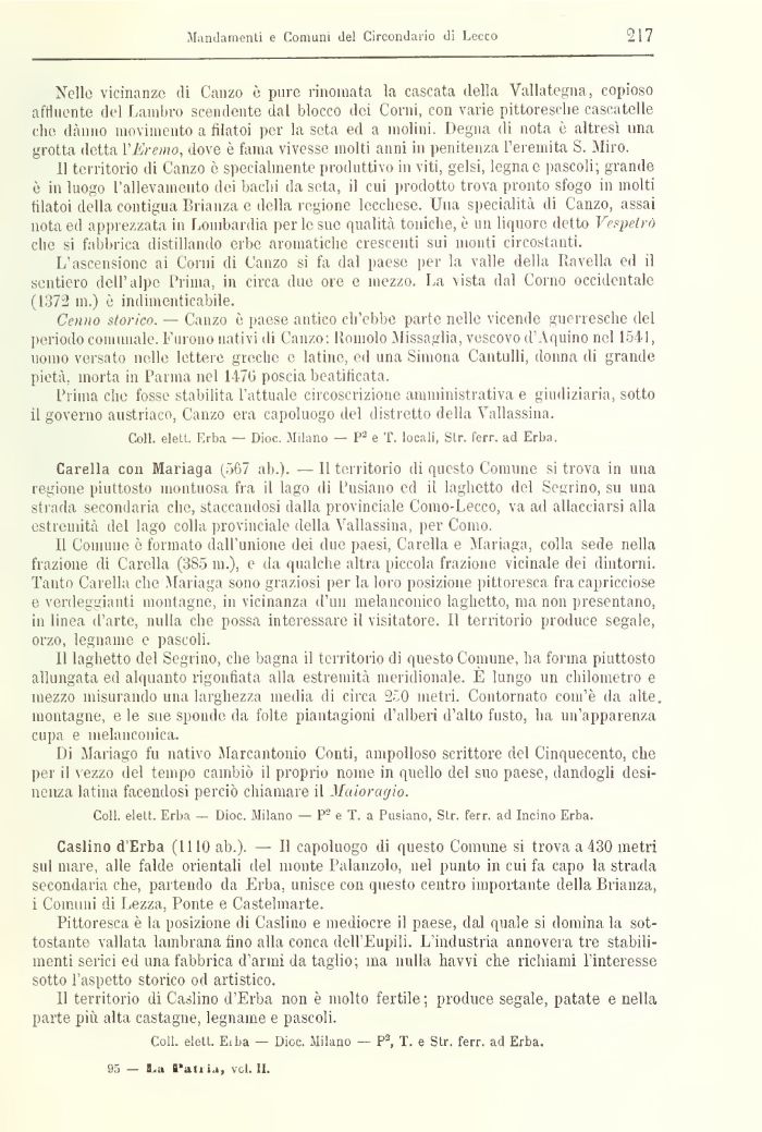 Caslino d'Erba (1110 ab.). — Il capoluogo di questo Comune si trova a 430 metri sul mare, alle falde orientali del monte Palanzolo, nel punto in cui fa capo la strada secondaria che, partendo da Erba, unisce con questo centro importante della Brianza, i Comuni di Lezza, Ponte e Castelmarte.