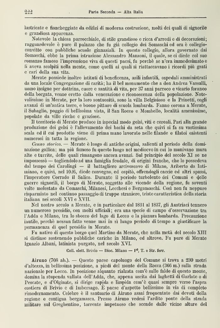 Airuno (708 ab.). — Questo paese capoluogo del Comune si trova a 230 metri d'altezza, in bellissima posizione, a piedi del monte della Bocca (306 m.) sulla strada nazionale per Lecco. In posizione alquanto rialzata com'è sulle falde di questo monte, domina la stupenda vallata dell'Adda, che, appena uscita dai laghetti di Cariate o di Pescate, e d'Olginate, si dirige rapida e limpida com'è quasi sempre verso l'aspra costiera di Brivio e di Inibersago. È paese d'aspetto bellissimo in via di completo rimodernamento. Celebre è il santuario di Airuno assai frequentato dai devoti della regione e contigua bergamasca. Presso Aìruuo vedesi l'ardito ponte della strada militare sul Greghentino, torrente impetuoso che scende dalle vicine alture del