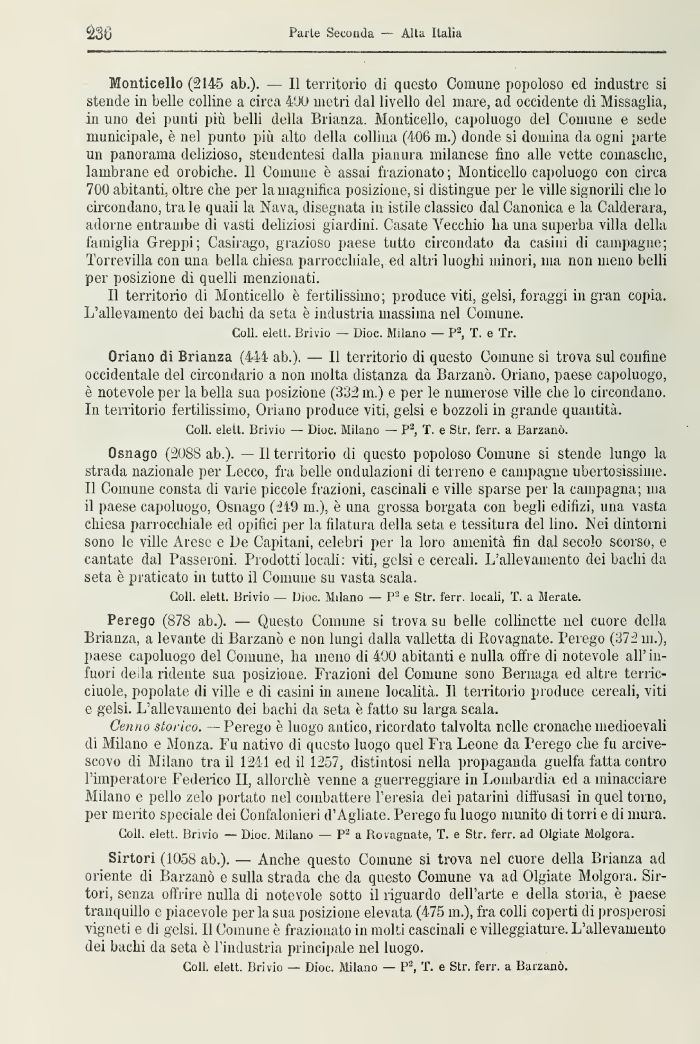 Perego (878 ab.). — Questo Comune si trova su belle collinette nel cuore della Brianza, a levante di Barzanò e non lungi dalla valletta di Rovagnate. Perego (372 m.), paese capoluogo del Comune, lia meno di 400 abitanti e nulla offre di notevole all' infuori della ridente sua posizione. Frazioni del Comune sono Bernaga ed altre terric-ciuole, popolate di ville e di casini in amene località. 11 territorio produce cereali, viti e gelsi. L'allevamento dei bachi da seta è fatto su larga scala.