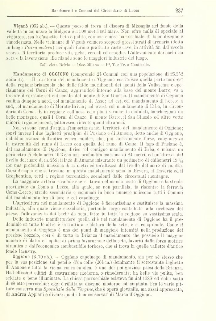 Oggiono (3170 ab.). — Oggiono capoluogo di mandamento, sia per sè stesso che per la sua posizione sul pendìo d'un colle (264 m.) dominante il sottostante laghetto di Annone e tutta la vicina conca eupilea, è uno dei più graziosi paesi della Brianza. Ha bellissimi edilizi di costruzione moderna, o rimodernati; ha belle vie pulite, ben selciate e bene illuminate. La chiesa parrocchiale esisteva fili dal 12SS ed ebbe sotto di sè otto parrocchie; oggi è rifatta su disegno moderno ed ampliata. Fra le varie pitture conserva uno Sposalizio della Vergine, che è opera giovanile, ma assai apprezzata, di Andrea Appiani e diversi quadri ben conservati di Marco d'Oggiono.