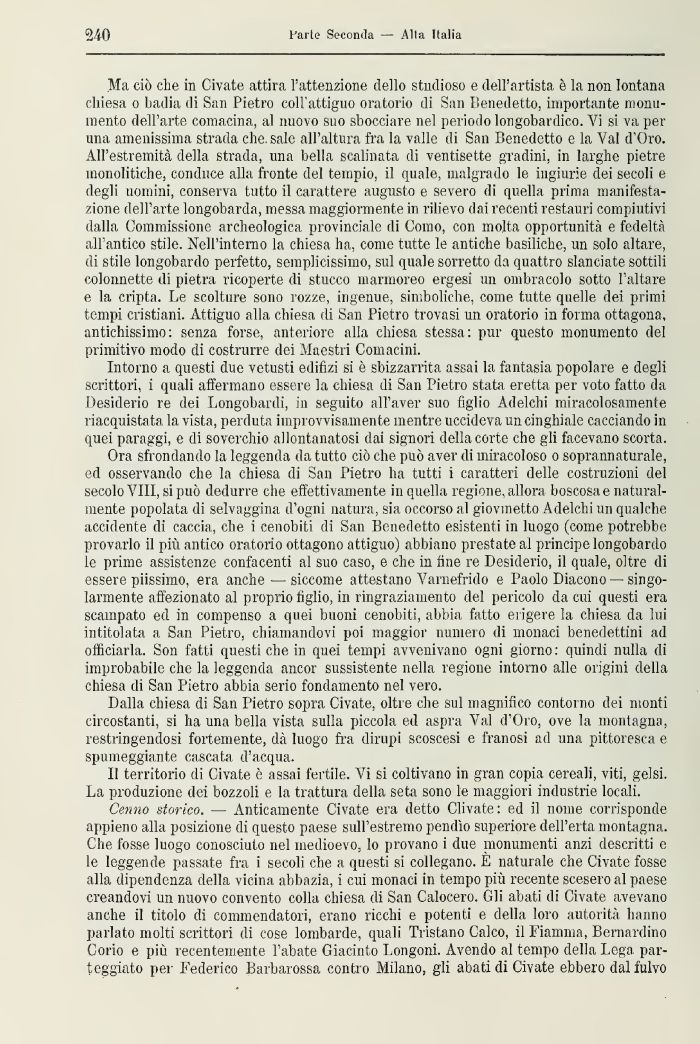 Ma ciò elio in Givate attira l'attenzione dello studioso e dell'artista è la non lontana chiesa o badia di San Pietro coll'attiguo oratorio di San Benedetto, importante monumento dell'arte comacina, al nuovo suo sbocciare nel periodo longobardico. Vi si va per una amenissinia strada che. sale all'altura fra la valle di San Benedetto e la Val d'Oro. All'estremità della strada, una bella scalinata di ventisette gradini, in larghe pietre monolitiche, conduce alla fronte del tempio, il quale, malgrado le ingiurie dei secoli e degli uomini, conserva tutto il carattere augusto e severo di quella prima manifestazione dell'arte longobarda, messa maggiormente in rilievo dai recenti restauri compiutivi dalla Commissione archeologica provinciale di Conio, con molta opportunità e fedeltà all'antico stile. Nell'interno la chiesa ha, come tutte le antiche basiliche, un solo altare, di stile longobardo perfetto, semplicissimo, sul quale sorretto da quattro slanciate sottili colonnette di pietra ricoperte di stucco marmoreo ergesi un ombracolo sotto l'altare e la cripta. Le scolture sono rozze, ingenue, simboliche, come tutte quelle dei primi tempi cristiani. Attiguo alla chiesa di San Pietro trovasi un oratorio in forma ottagono, antichissimo: senza forse, anteriore alla chiesa stessa: pur questo monumento del primitivo modo di costrurre dei Maestri Coni acini.