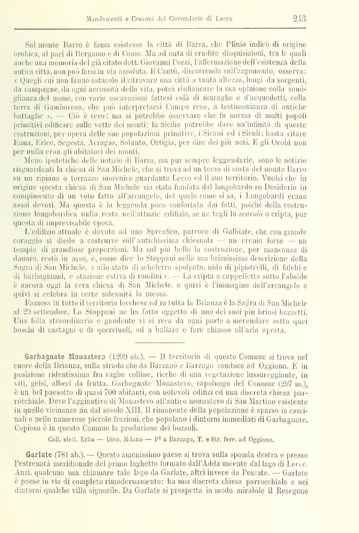 Sul monte Barro è fama esistesse la città di Barra, che Plinio indicò di origine orobica, al pari di Bergamo e di Como. Ma ad onta di erudite disquisizioni, tra le quali anche una memoria del già citato dott. Giovanni Pozzi, l'affermazione dell esistenza della antica città, non può farsnn via assoluta. 11 Cantù, discorrendo sull'argomento, osserva; < Quegji cui non l'anno ostacolo il ritrovare una città a tanta altezza, lungi da sorgenti, ila campagne, da ogni necessità della \ ita, potrà nntiancare la sua opinione colla somiglianza del nome, con varie estivazioni fattesi colà di muraglie e d'acquedotti, colla terra di Gambnreso, che può interpretarsi Campo reso, a testimonianza di antiche battaglie >. — Ciò è vero: ma si potrebbe ossei vare che fu norma di molti popoli primitivi edificare sulle vette dei monti: la Sicilia potrebbe dare un'infinità di queste costruzioni, per opera delle sue popolazioni primitive, i Sicani ed i Siculi: basta citare Ernia, Enee, Segesta, Vcragas, Sohmto, Ortigia, per dire dei più noti. E gli Orobi non per nulla eran gli abitatori dei moliti.