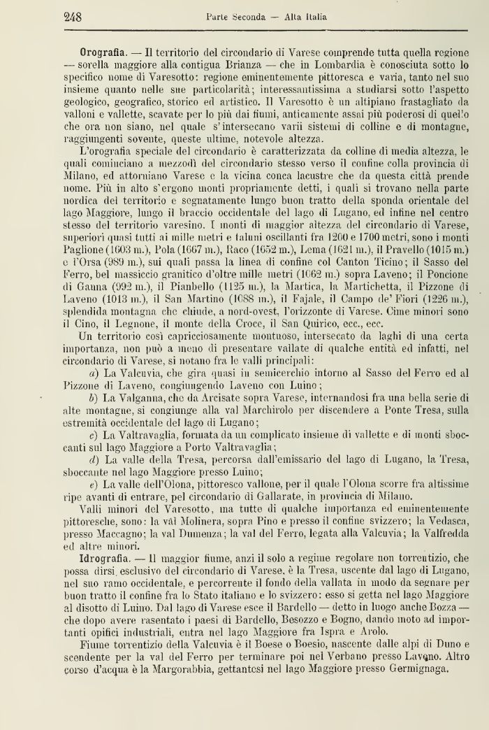 L'orografia speciale del circondario è caratterizzata da colline di media altezza, le quali cominciano a mezzodì del circondario stesso verso il confine colla provincia di Milano, ed attorniano Varese e la vicina conca lacustre che da questa città prende nome. Più in alto s'ergono monti propriamente detti, i quali si trovano nella parte nordica del territorio e segnatamente lungo buon tratto della sponda orientale del lago Maggiore, lungo il braccio occidentale del lago di Lugano, ed infine nel centro stesso del territorio varesino. 1 monti di maggior altezza del circondario di Varese, superiori quasi tutti ai mille metri e taluni oscillanti fra 1200 e 1700 metri, sono i monti Paglione (1003 ni.), Pola (1007 m.), Baco (1052 m.), Lorna (1621 in.), il Pravello (1015 m.) e l'Orsa (989 in.), sui quali passa la linea di confine col Oanton Ticino ; il Sasso del Ferro, bel massiccio granitico d'oltre mille metri (1062 ni.) sopra Laveno; il Poncione di Gamia (992 in.), il Pianbello (1125 ni.), la Martica, la Martichetta, il Pizzone di Laveno (1013 m.), il San Martino (10SS m.), il Fajale, il Campo de'Fiori (1226 in.), splendida montagna che chiude, a nord-ovest, l'orizzonte di Varese. Cime minori sono il Gino, il Legnone, il monte della Croce, il San Quirico, ecc., ecc.