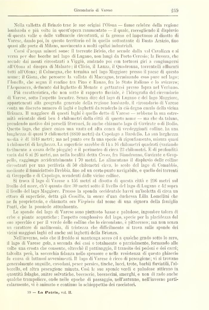 Più caratteristica, che non sotto il rapporto fin viale, è l'idrografia del circondario di Varese, sotto l'aspetto lacustre. Senza dire del lago di Lugano e del lago Maggiore, appartenenti alla geografia generale della regione lombarda, il circondai io di \ arese conta un discreto numero di laghi e laghetti da renderlo in ciò degno emulo della vicina Urianza. 11 maggiore di questi laghi è quello detto di Varese — sebbene la sua estremità orientale disti ben 4 chilometri dalla città di questo nome — ma che ila taluno, prendendo motivo dai paeselli litoranei, fu anche chiamato lago di Gavirate odi Bodio. Questo lago, che giace entro una vasta ed alta conca di verdeggianti colline ha una lunghezza di quasi 0 chilometri (SSK) metri) da Capolago a 1 lardello» La sua larghezza media è di lSIS metri; ma nel punto ove fa una specie di rigonfiamento, misura quasi •i chilometri di larghezza. La superficie sarebbe di 1 ì a 1G chilometri quadrati (variando facilmente a causa delle pioggie) e il perimetro di circa 23 chilometri. E di profondità varia dai G ai 2G metri, ma nella località detta Crctts, fra Biandronno, Gavirate e Grop-pello, raggiunge accidentalmente ì 70 metri. Lo alimentano il displuvio delle colline circostanti per una periferia di 50 chilometri circa, lo scolo del lago di Comabbio, mediante il fiumiciattolo Brebbia. tino ad un certo punto navigabile, e quello dei torrenti di Groppello e di Capolago, scendenti dalle vicine colline.