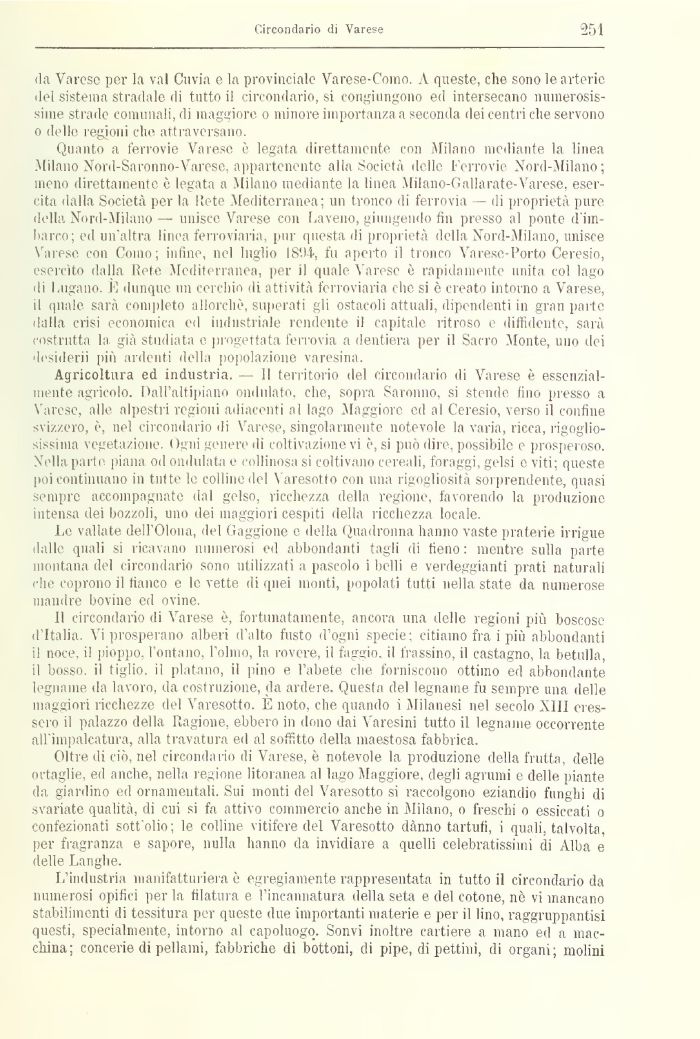 Quanto a ferrovie Varese è legata direttamente con Milano mediante la linea Milano Nord-Saronno-Varese, appartenente alla Società delle Ferrovie Nord-Milano; meno direttamente è legata a Milano mediante la linea Milano-Gallarate-Varese, esercita dalla Società per la liete Mediterranea: un tronco di ferrovia - di proprietà pure didla Nord-Milano— unisce Varese con Laveiio, giungendo fin presso al ponte d imbarco; ed un'altra linea ferroviaria, pur questa di proprietà della Nord-Milano, unisce \ iirese con Como; infine, nel luglio 181)4, fu aperto il tronco Varese-Porto Ceresio, esercito dalla Rete Mediterranea, per il quale Varese è rapidamente unita col lago di Lugano. È dunque un cerchio di attività ferroviaria che si è creato intorno a Varese, d quale sarà completo allorché, superati gli ostacoli attuali, dipendenti in gran parte dalla crisi economica ed industriale rendente d capitale ritroso e diffidente, sarà costrutta hi. già studiata e progettata ferrovia a dentiera per il Sacr o Monte, uno dei desklerii pili ardenti della popolazione varesina.