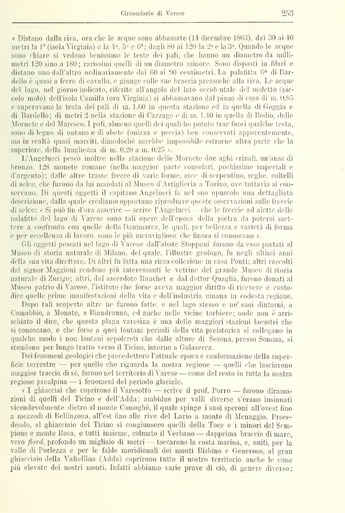 < Distailo dalla riva, ora che le acque sono abbassate (14 dicembre 1863), dai 30 ai 40 metri la 1 (isola V irginia) e la la, 5 e 6*; dagli SO ai 120 la ,a e la 3*. Quando le acque sono chiare si vedono benissimo le teste dei pali, che barino un diametro da millimetri 120 sino a 180 ; rarissimi quelli di un diametro minore. Sono disposti ni filari e distano uno dall'altro ordinaria niente dai 60 ai 00 centimetri. La palafitta Ca eli Bar-delio è quasi a ferro di cavallo, e giunge colle sue braccia pressoché alla riva. Le acque del lago, nel giorno indicato, riferite all'angolo de! lato occidentale del inoletto (piccolo molo) dell'isola Cannila (ora Virginia) si abbassavano dal piano di esso di in. 0.85 e superavano la testa dei pali di m. 1.60 in questa stazione ed ni quella di Goggia e (li Bardello; di metri 2 nella stazione dì Cazzago e di ni. 1.40 m quella di Rodio, delle Mornete e del Maresco. I pali, almeno quelli d( i quali ho potuto trai' fuori qualche testa, sono di legno di ontano e di abete (onizza e peccia) ben conservati apparentemente, ma in realtà (piasi marciti, dimodoché sarebbe impossibile estrarne altra parte che la superiore, della lunghezza di m. 0.20 a ni. 0.25 ».
