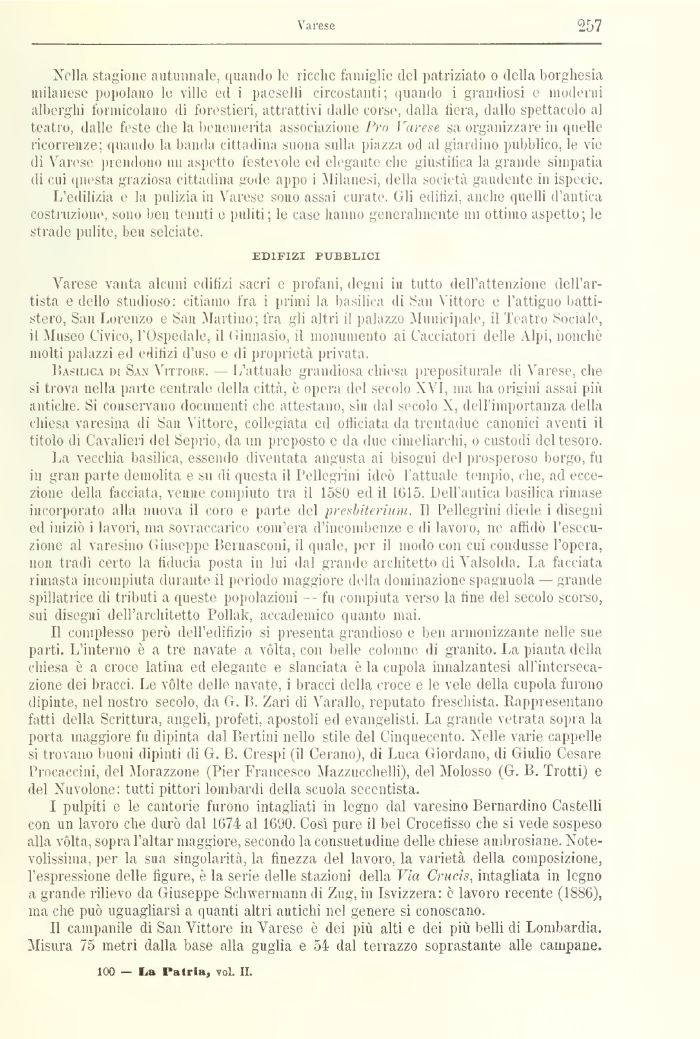 Varese vanta alcuni edilizi sacri e profani, degni ni tutto dell attenzione dell'artista e dello studioso: citiamo fra i primi la basilica di San Vittore e l'attiguo battistero, San Lorenzo e San Martino; fra gli altri il palazzo Municipale, il Teatro Sociale, i! Museo Civico, 1 Ospedale, il Ginnasio, il monumento ai Cacciatori delle Alpi, nonché molti palazzi ed edilizi d'uso e di proprietà privata.
