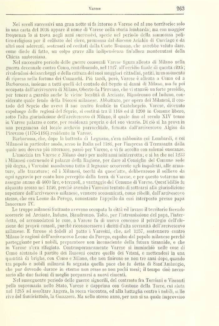 Nei secoli successivi ima gran notte si fa intorno a Varese, ed al suo territorio: solo ili una carta del 1036 appare il nome di Varese nella storia lombarda; ma con maggior frequenza lo si trova negli anni successivi, specie nel periodo della sommossa politico-religiosa per il celibato del clero, promossa dal diacono Arialdo di Cuccìago e da altri suoi aderenti, sostenuti ed eccitati dalla Corte Romana, clic avrebbe voluto dare, come, diede di fatto, un colpo grave alla indipendenza lin'allora mantenutasi della Chiesa ambrosiana.