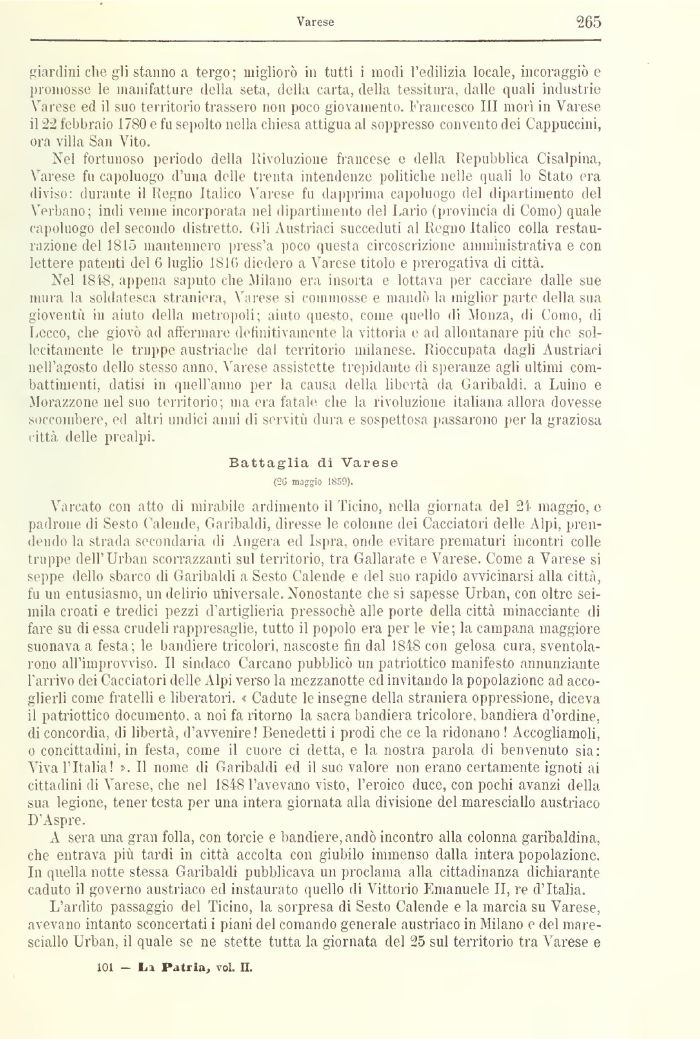 Nel 181-8, appena saputo che Milano era insorta e lottava per cacciare dalle sue mura la soldatesca straniera, Varese si commosse e mandò la miglior parte della sua gioventù in aiuto della metropoli; aiuto questo, come quello ili Monza, di Como, ili Lecco, che giovò ad affermare definitivamente la vittoria e ad allontanare più che sollecitamente le truppe austriache dal territorio milanese. Rioccupata dagli Austriaci nell'agosto dello stesso anno, Varese assistette trepidante di speranze agli ultimi combattimenti, datisi in quell'anno per la causa della libertà da Garibaldi, a Luino e Mora/zone nel suo territorio; ma era fatale che la rivoluzione italiana allora dovesse soccombere, ed altri undici anni eli servitù dura e sospettosa passarono per la graziosa città, delle prealpi.