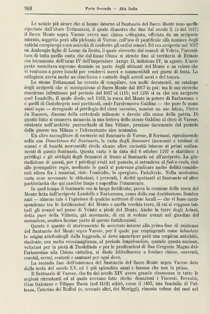 Le notizie più sicure che si hanno intorno al Santuario del Sacro -Monto sono quelle riportate dall'abate Tettamanzi, il quale dimostra che tino dal secolo X (o dal 1017) il Sacro Monte sopra Varese aveva una chiesa collegiata, officiata da un arciprete mitrato, soggetta però alla plebania di Varese, coll'uso di pontificale, alla maniera degli antichi corepiscopi e con autorità di conferire gli ordini minori. Ed era arciprete nel 1017 un Ambrogio figlio di Leone da Bosto, il quale ricevette dai consoli di Velate, l'investitura di tutta quella costa clie dal fiume (Bona si stende fino al territorio di Brinzio con istrumento dell'anno IV dell'imperatore Arrigo II, indizione IV, in agosto. L'arciprete esercitava spremo dominio su parte degli abitanti del Monte c su coloro che vi venivano a porre banchi per vendervi merci e commestibili nei giorni di festa. La collegiata aveva anche un cimeliarca o custode degli arredi sacri e del tesoro.