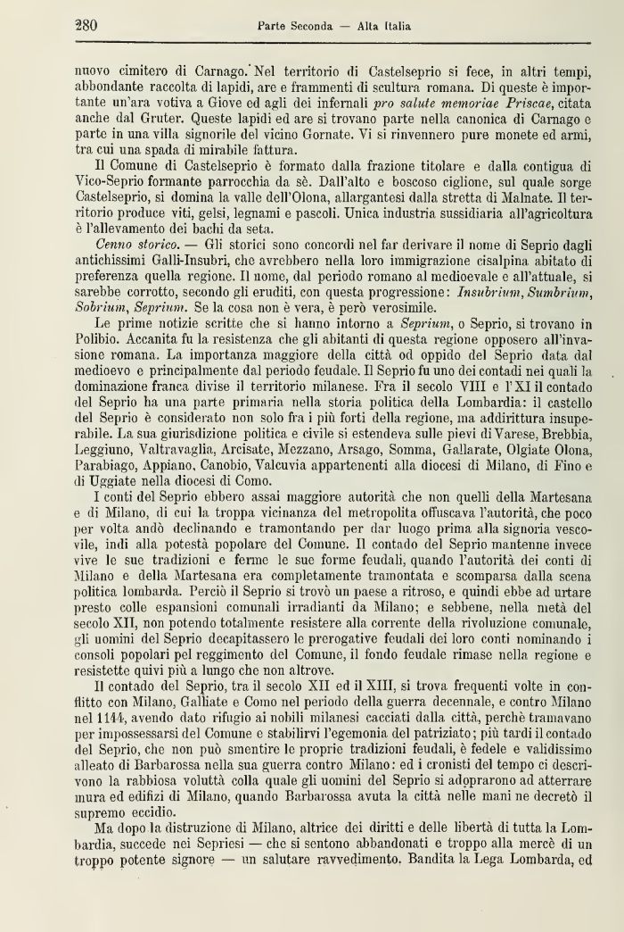 Cenno storico. — Gli storici sono concordi nel far derivare il nome di Seprio dagli antichissimi Galli-Insubri, che avrebbero nella loro immigrazione cisalpina abitato di preferenza quella regione. Il nome, dal periodo romano al medioevale e all'attuale, si sarebbe corrotto, secondo gli eruditi, con questa progressione: Insubrimn, Sumbrium, Sobrium, Seprium. So la cosa non è vera, è però verosimile.