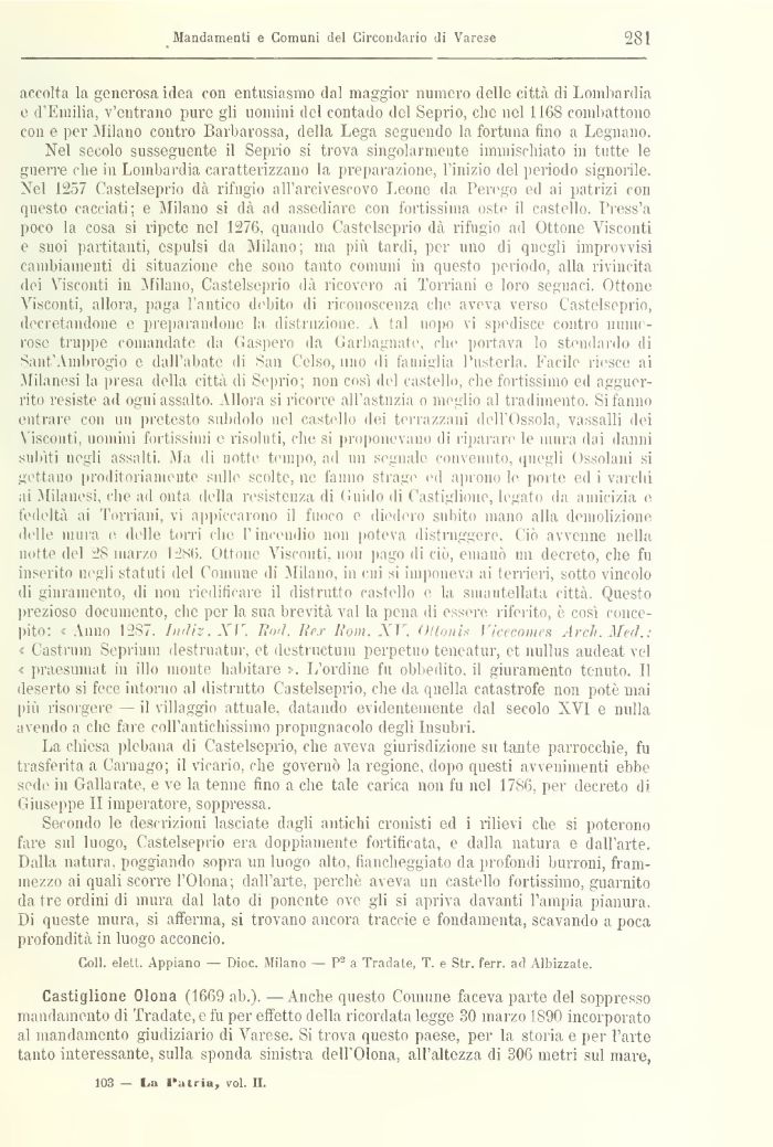 < praesinnat in ilio monte habitare ». L'ordine fu obbedito, il giuramento tenuto. Il deserto si fece intorno al distrutto Castelseprio, che da quella catastrofe non potè mai più risorgere — il villaggio attuale, datando evidentemente dal secolo XVI e nulla avendo a che fare coll'antìchissimo propugnacolo degli Insubri.