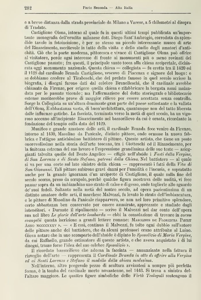 Castiglione Olona, intorno al quale fu in questi ultimi tempi pubblicata un'importante monografia dell'erudito milanese dott. Diego Sant'Ambrogio, corredata da splendide tavole in fotoincisione, è per se stesso un piccolo interessante museo di arte del Rinascimento, meritevole in tutto della visita e dello studio degli amatori d'antichità. Ciò che la parte moderna, pittoresca e vivace di Castiglione Olona può offrire al visitatore, perde ogni interesse di fronte ai monumenti più o meno rovinati del Castiglione passato: fra questi, ti principale vanto tocca alla chiesa arcipretale, dichiarata oggi monumento nazionale. Questa chiesa — collegiata — fu eretta tra il 1420 ed il 142^ dal cardinale Branda Castiglione, vescovo di Piacenza e signore del luogo : e se dobbiamo credere al Tiraboschi, che del prelato famoso in quel secolo scrisse la biografia, i disegni furono dati dal celebre Brunellesclii, che il cardinale avrebbe chiamato da Firenze, per erigere quella chiesa e rifabbricare la borgata assai malandata per le passate vicende ; ma l'affermazione del dotto storiografo e bibliotecario estense meriterebbe prove di maggior rilievo per essere accettata senza controllo. Sorge la Collegiata su un'altura dominante gran parte del paese sottostante e la vallata dell'Olona. E abbastanza vasta, di buon'architettura, quantunque non del tutto liberata dalle influenze gotiche. La facciata, terminata verso la metà di quel secolo, ha un vigoroso accenno all'incipiente Rinascimento nel bassorilievo da cui è ornata, ricordante la fondazione del tempi© colla data del 1429.