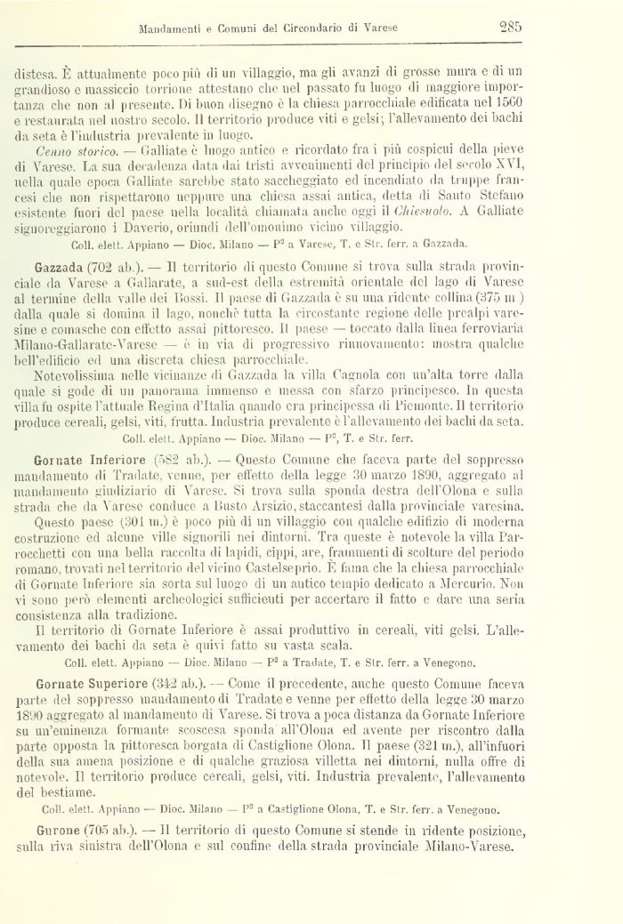 Gornate Superiore (342 ab.). — Come il precedente, anche questo Connine faceva parte del soppresso mandamento di Tradate e venne per effetto della legge 30 marzo 1890 aggregato al mandamento ili Varese. Si trova a poca distanza da Gornate Inferiore su un'eminenza formante scoscesa sponda all'Olona ed avente per riscontro dalla parte opposta la pittoresca borgata di Castiglione Olona. Il paese (321 m.), all'infuori della, sua amena posizione e di qualche graziosa villetta nei dintorni, nulla offre di notevole! Il territorio produce cereali, gelsi, viti. Industria prevalente, l'allevamento del bestiame.