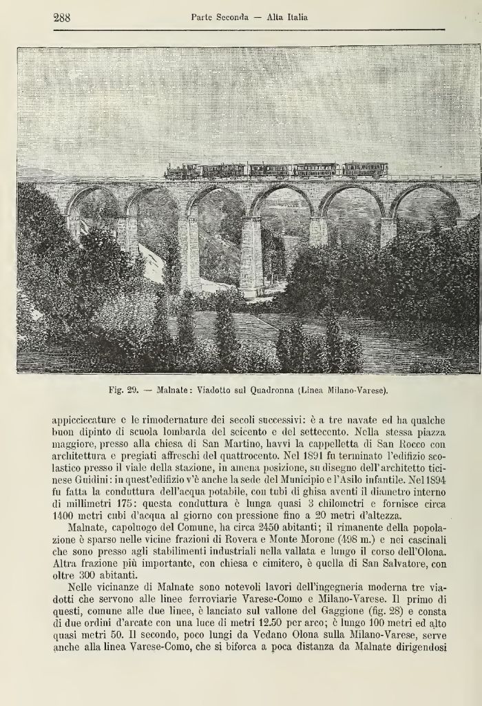 Nelle vicinanze di Malnate sono notevoli lavori dell'ingegneria moderna tre viadotti che servono alle linee ferroviarie Varese-Como e Milano-Varese. Il primo di questi, comune alle due linee, è lanciato sul vallone del Gaggione (fig. 28) e consta di due ordini d'arcate con una luce di metri 12.50 per arco; è lungo 100 metri ed alto quasi metri 50. Il secondo, poco lungi da Vedano Olona sulla Milano-Varese, serve anche alla linea Varese-Como, che si biforca a poca distanza da Malnate dirigendosi