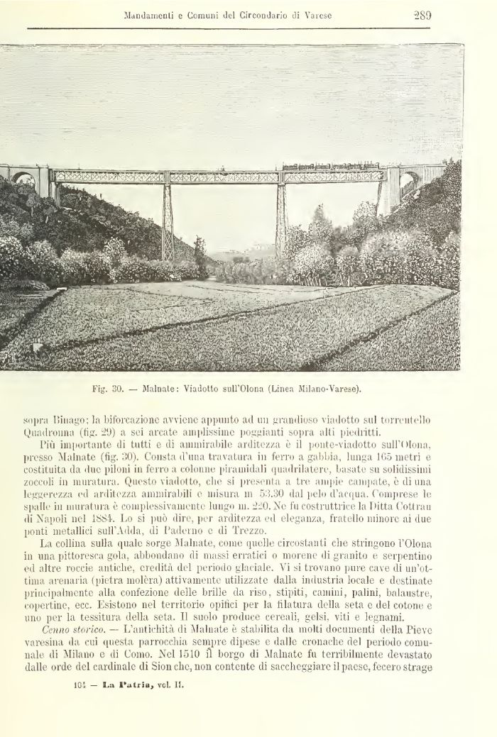 Più importante di tutti e di ammirabile arditezza è il ponte-viadotto sull'Olona, presso Malnate (tig. 30). Consta d'una travatura in ferro a gabbia, lunga 165 metri e costituita da due piloni iti ferro a colonne piramidali quadrilatere, basate su solidissimi zoccoli in muratura. Questo viadotto, che si presenta a tre ampie campate, è di una leggerezza ed arditezza ammirabili e misura m 53.30 dal pelo d'acqua. Comprese le spalle in muratura è complessivamente lungo ni. -2-J). Ne fu costruttrice la Ditta Cottrau di Napoli nel 1884. Lo si può dire, per arditezza ed eleganza, fratello minore ai due ponti metallici snfl'Adda, di ['adorno e di Trozze.