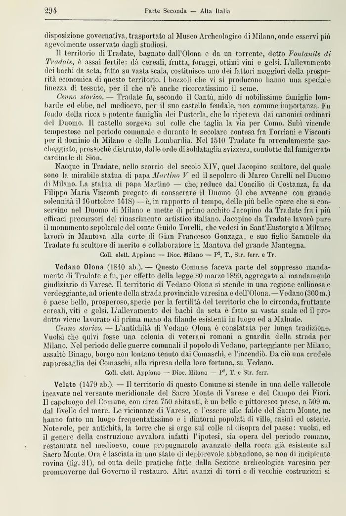 Velate (1479 ab.). — Il territorio di questo Comune si stende in una delle vallecole incavate nel versante meridionale del Sacro Monte di Varese e del Campo dei Fiori. 11 capoluogo del Comune, con circa 750 abitanti, è un bello e pittoresco paese, a 509 m. dal livello del mare. Le vicinanze di Varese, e l'essere alle falde del Sacro Monte, ne hanno fatto un luogo frequentatissimo e i dintorni popolati di ville, casini ed osterie. Notevole, per antichità, la torre che si erge sul colle al disopra del paese: vuoisi, ed il genere della costruzione avvalora infatti l'ipotesi, sia opera del periodo romano, restaurata nel medioevo, come propugnacolo avanzato della rocca già esistente sul Sacro Monte. Ora è lasciata in uno stato di deplorevole abbandono, se non di incipiente rovina (lig. 31), ad onta delle pratiche fatte dalla Sezione archeologica varesina per promuoverne dal Governo il restauro. Altri avanzi di torri e di vecchie costruzioni si