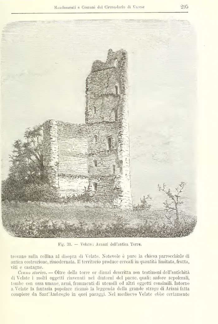 Cenno storico. — Oltre della torre or dianzi descritta son testimoni dell'antichità di Velate i molti oggetti rinvenuti nei dintorni del paese, quali : anfore sepolcrali, tombe con ossa umane, armi, frammenti di utensili ed altri oggetti consimili. Intorno a Velate la fantasia popolare ricaṃ la leggenda della grande strage di Ariani fatta compiere da Sant'Ambrogio in quei paraggi. Nel medioevo Velate ebbe certamente