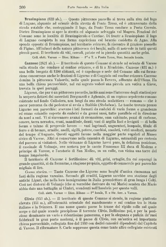 Cazzone (2421 ab.). — Il territorio di questo Comune si stende ad oriente di Varese sulla strada che conduce, al confine svizzero, e di là a Mendrisio. Cazzone (431 in.) è una bella borgata di 1200 abitanti, ed è capoluogo e sede del Comune alla cui formazione concorrono anche le frazioni di Ligurno e di 0aggio!» sul confine, svizzero. Cazzone domina la pittoresca Yalsorda, nella quale passa la Pevera, affluente dell'Olona. Ha una bella chiesa parrocchiale, nel cui sagrato vedesi una piccola ara votiva a Giove, trovata in quei paraggi.