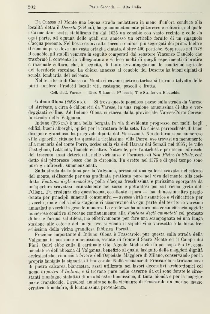 Da Cuasso al Monte lina buona strada mulattiera in meno d'un'ora conduce alla località detta il Deserto (869 in.), luogo eminentemente pittoresco e solitario, nel quale i Carmelitani scalzi stabilirono fin dal 1635 un cenobio con vasto recinto e celle da ogni parte, ad ognuna delle quali era annesso un orticello fornito eli un rigagnolo d'acqua perenne. Nel bosco eranvi altri pìccoli romitori più segregati dei primi. Inoltre il cenobio possedeva una vasta ortaglia cintata, d'oltre 400 pertiche. Soppresso nel 1778 il cenobio, gli stabili vennero in seguito comperati dal senatore Vincenzo Dandolo che trasformò il convento in villeggiatura e vi fece molti di quegli esperimenti di pentirà e razionale coltura, che, in seguito, di tanto avvantaggiarono le condizioni agricole del territorio varesino. La chiesa annessa al cenobio del Deserto ha buoni dipinti di scuola lombarda del seicento.