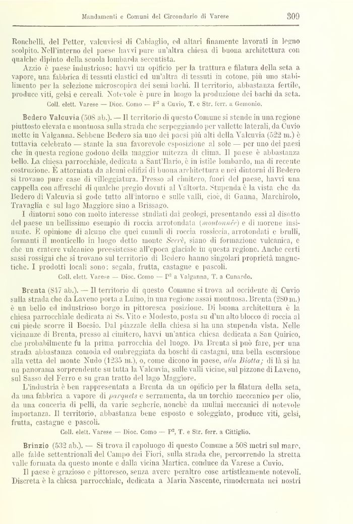 Brenta (S47 ab.). — Il territorio di questo Comune si trova ad occidente di Cuvio sulla strada che da Laveno porta a Ialino, in una regione assai montuosa. Brenta (280 ni.) è un bello ed industrioso borgo in pittoresca posizione. Di buona architettura è la chiesa parrocchiale dedicata ai Ss. Vito e Modesto, posta su d'un alto blocco di roccia al cui piede scorre il Boesio. Dal piazzale della chiesa si ha una stupenda vista. Nelle \icinanze dì Brenta, presso al cimitero, havvi un'antica chiesa dedicata a San Quirico, che probabilmente fu la prillisi parrocchia del luogo. Da Brenta si può fare, per una strada abbastanza comoda ed ombreggiata da boschi di castagni, una bella escursione alla vetta del monte Nudo (1235 ni.), o, come dicono ili paese, atta Biotta; ili là si ha un panorama sorprendente su tutta la alcuvia, sulle valli vicine, sul pizzone di Laveno, sul Sasso del Ferro e su gran tratto del lago Maggiore.
