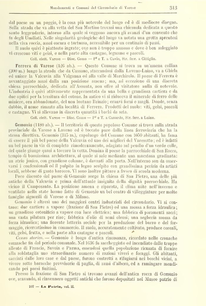 Ferrera di Varese (426 ab.). — Questo Comune si trova su un'amena collina (300 ni.) lungo la strada che da Cassano, staccandosi dalla Laveno-Luino, va a Giuria ed unisce la Valcuvia alla Valganna ed alla valle di Marclnrolo. Il paese di Ferrera è avvantaggiato assai dalla sua posizione amena; ma, ad eccezione di una discreta chiesa parrocchiale, dedicata all'Assunta, non offre al visitatore nulla di notevole. L'industria è quivi attivamente rappresentata da una bella e grandiosa cartiera e da due opifici per la tessitura del cotone. In antico vi si riduceva il minerale di ferro delle miniere, ora abbandonate, del non lontano Brinzio; erauu forni e magli. Donde, senza dubbio, il nome rimasto alla località di Ferrera. Prodotti del suolo: \iti, gelsi, pascoli e castagne. Vi si allevano ili discreta quantità i bachi da seta.
