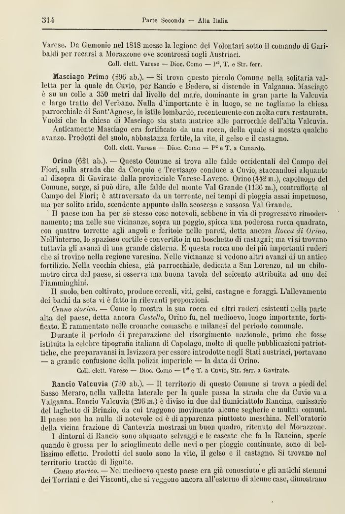 Masciago Primo (290 ab.). — Si trova questo piccolo Comune nella solitaria valletta per la quale da Cuvio, per Rancio e Bedero, si discende in Valganna. Masciago è su un colle a 350 metri dal livello del mare, dominanti 111 gran parte la Valcuvia e largo tratto del Verbano. Nulla d'importante è ili luogo, se ne togliamo la chiesa parrocchiale di Sant'Agnese, in istile lombardo, recentemente con molta cura restaurata. Vuoisi che la chiesa di Masciago sia stata matrice alle parrocchie dell'alta Valcuvia.