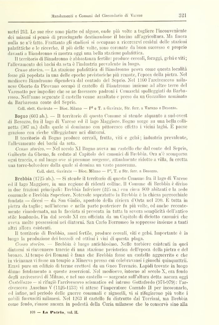 Cenno storico. — Brebbia è luogo antichissimo. Nelle torbiere esistenti in quei dintorni si rinvennero traccie di una stazione preistorica dell'epoca della pietra e del bronzo. Al tempo dei Romani è fama che Brebbia fosse un castello agguerrito e che in vicinanza vi fosse nn tempio a Minerva presso cui celebravansi i giuochi quinquattrii. Eravi pure un edilizio di terme erettovi da un Gneo Terenzio. Lapidi trovate in luogo dànno fondamento a queste asserzioni. Nel medioevo, intorno al secolo X, era feudo degli arcivescovi di Milano, e nel suo castello — sorgente sull'altura detta ancora oggi CasteUuzzo — si rifugiò l'arcivescovo scismatico ed intruso Gottofredo (974-979): l'arcivescovo Anselmo V (1126-1133) vi attese l'imperatore Corrado II per incoronarlo, ed infine, nel periodo delle guerre comunali e signorili, vi si rifugiarono più volte i nobili fuorusciti milanesi. Nel 12G3 il castello fu distrutto dai Torriani, ma Brebbia come feudo, rimase ancora in podestà della Curia milanese che lo conservò sino alla