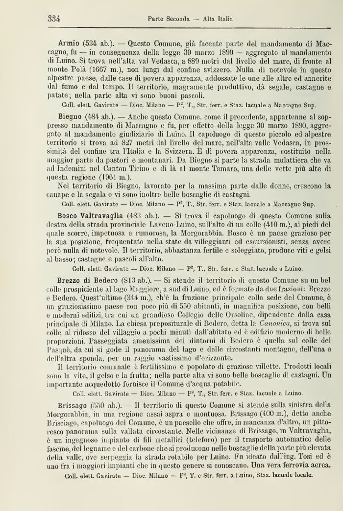 Brezzo di Bedero (813 ab.). — Si stende il territorio di questo Comune su un bel colle prospiciente al lago Maggiore, a sud di Luino, ed è formato da due frazioni : Brezzo e Bedero. Quest'ultimo (344 in.), ch'è la frazione principale colla sede del Comune, è un graziosissimo paese con poco più di 550 abitanti, in magnifica posizione, con belli e moderni edilizi, tra cui un grandioso Collegio delle Orsoline, dipendente dalla casa principale di Milano. La chiesa prepositurale di Bedero, detta la Canonica, si trova sul colle al ridosso del villaggio a pochi minuti dall'abitato ed è edilizio moderno di belle proporzioni. Passeggiata amenissima dei dintorni di Bedero è quella sul colle del Pasque, da cui si gode il panorama del lago e delle circostanti montagne,, dell'una e dell'altra sponda, per un raggio vastissimo d'orizzonte.