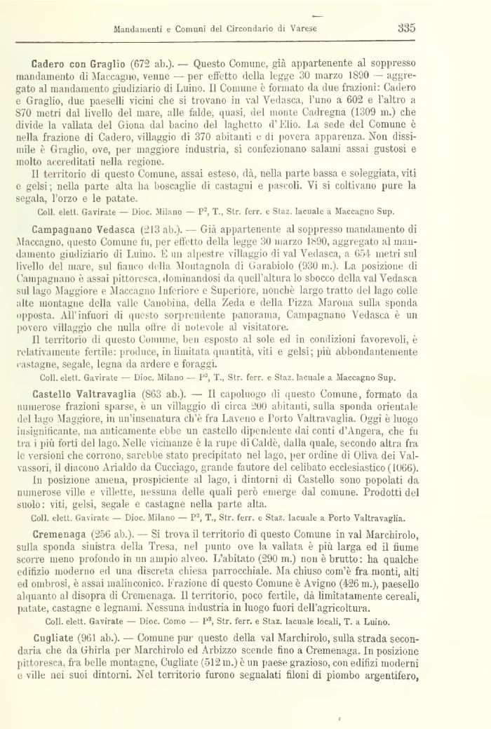 Cadero con Graglio (672 ab.)- — Questo Comune, già appartenente al soppresso mandamento di Maccaguo, venne — per effetto della legge 30 marzo 1890 - aggregato al mandamento giudiziario di Luino. Il Comune è formato da due frazioni ; Cadero e Graglio, due paeselli vicini che si trovano in vai Vedasca, l'uno a 602 e l'altro a S70 metri dal livello del mare, alle falde, quasi, del monte Cadregna (1309 in.) che divide la vallata del Giona dal bacino del laghetto d'Elio. La sede del Comune è nella frazione di Cadero, villaggio di 370 abitanti e di povera apparenza. Non dissimile è Graglio, ove, per maggiore industria, si confezionano salami assai gustosi e molto accreditati nella, regione.