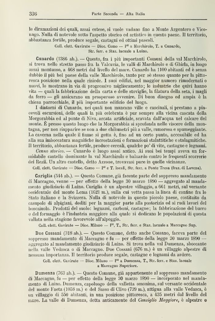 Cunardo (1386 ab.). — Questo, fra i più importanti Comuni della vai Marchirolo, si trova nello stretto passo fra la Valcuvia, le valli di Marcliirolo e di Ghirla, in luogo assai montuoso, a 468 metri dal livello del mare. Cunardo lia 1100 abitanti ed è senza dubbio il più bel paese della valle Marcliirolo, tanto per sè stesso quanto per la pittoresca posizione nella quale risiede. I suoi edilìzi, nel maggior numero rimodernati o nuovi, lo mostrano in via di progressivo miglioramento; le industrie che quivi hanno vita — quali la fabbricazione della carta e delle stoviglie, la filatura della seta, i magli da ferro — gli assicurano un prosperoso avvenire. Di buon disegno ed ampia è la chiesa parrocchiale, il più importante edilizio del luogo.