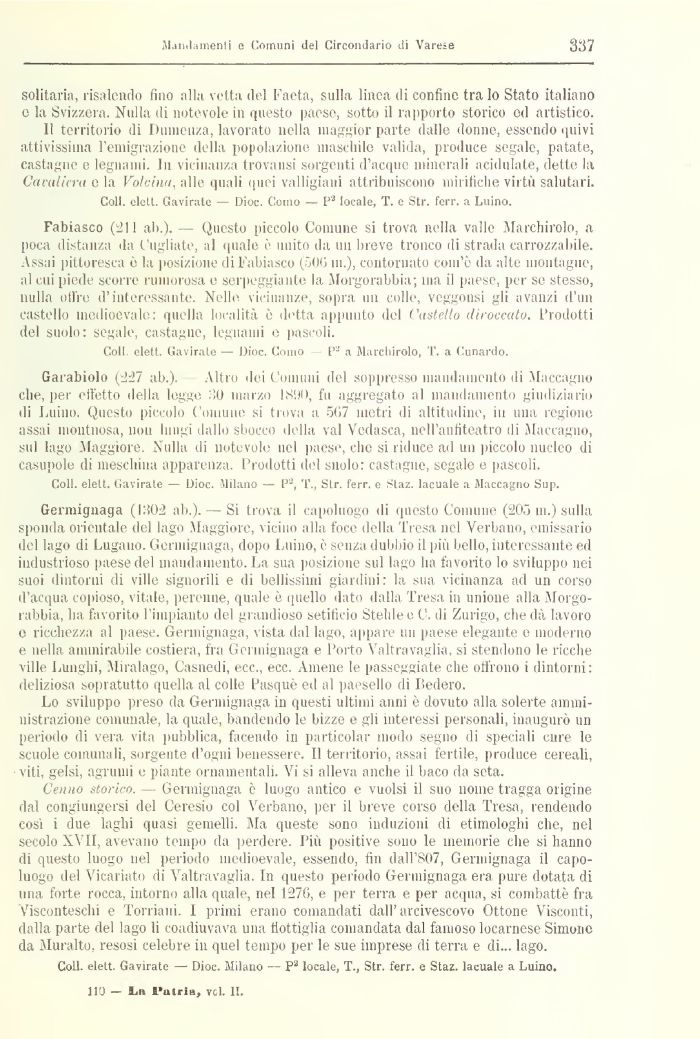 Germicjnaga (1302 ab.). — Si trova il capoluogo di questo Comune (205 in.) sulla sponda orientale del lago Maggiore, vicino alla foce della Tresa nel Verbano, emissario del lago di Lugano, Gerinignaga, dopo Luino, è senza dubbio il più bello, interessante ed industrioso paese del mandamento. La sua posizione sul lago ha favorito lo sviluppo nei suoi dintorni di ville signorili e di bellissimi giardini: la sua vicinanza ad un corso d'acqua copioso, vitale, perenne, quale è quello dato dalla Presa in unione alla Morgorabbia, ha favorito 1 impianto del grandioso setificio Stelli e C C, di Zurigo, che dà lavoro e ricchezza al paese. Gerinignaga, \ista dal lago, appare un paese elegante e moderno e nella ammirabile costiera, fra Gei ìnignaga e Porto Yaltnivaglia, si stendono le ricche ville Lunghi, Miralago, Casnedi, ecc., ecc. Amene le passeggiate che offrono i dintorni: deliziosa sopratutto quella al colle Pasque ed al paesello di Lederò.