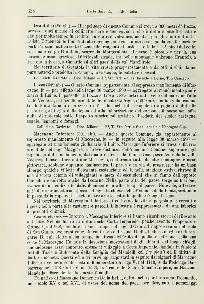 Cenno storico. — Intorno a Maccagno Inferiore si hanno ricordi storici rli rilevante antichità. Nel medioevo fu detto anche Corte Imperiale, poiché avendo l'imperatore Ottone I, nel 962, mandate le sue truppe sul lago d'Orta ad impossessarsi dell'isola di San Giulio, ove erasi rifugiata col tesoro del regno, Grilla, l'odiosa moglie di Berengario IL, egli stette alcun tempo in attesa dell'esito di quella spedizione colla sua corte in Maccagno. Fu tale la devozione mostratagli dagli abitanti del luogo ch'egli, andandosene assai contento, eresse il villaggio a Corte Imperiale, dandola in feudo ai fratelli Tazio e Rubiconte della famiglia dei Man del li, col jus gladii ed il diritto di battere moneta. Questi ed altri privilegi acquistati in seguito dai signori di Maccagno Inferiore vennero confermati dall'imperatore Arrigo V, nel 1110, e da Federigo Bar-barossa, nel 1158. Carlo V, nel 1536, creò conte del Sacro Romano Impero, un Giacomo Mandella, discendente da questa famiglia.